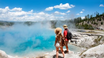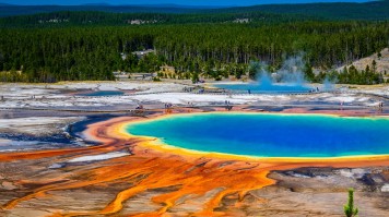 • Troisième plus grande source d’eau chaude au monde, la Grand Prismatic Spring du parc national de Yellowstone est connue pour la couleur bleue vive de son eau ainsi que pour le kaléidoscope de couleurs qui change constamment sur le pourtour de la source.