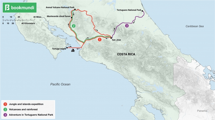 Arrivée à San José, la capitale du Costa Rica, et découverte de la ville en prenant le temps d’explorer les principaux sites touristiques tels que le marché central et le théâtre national. Après un peu de temps libre dans la jungle urbaine de San José, dirigez-vous vers la côte pacifique du pays et montez à bord d’un catamaran de luxe pour une excursion d’une journée depuis San José jusqu’à la magnifique île de Tortuga, qui abrite des plages de sable blanc et des hauts-fonds chauds parfaits pour la baignade et la plongée avec masque et tuba. De retour sur la terre ferme, vous pourrez découvrir les sources d’eau chaude naturelles qui entourent le sommet du volcan Arenal, avant d’explorer la région de plus près en faisant de la tyrolienne d’arbre en arbre et du rafting sur les 12 kilomètres de la rivière Sarapiqui, de Hacienda à Chilamate. Voir le circuit