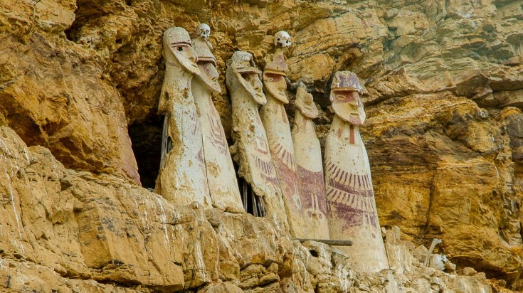 Les Chachapoya avaient des rituels funéraires élaborés et l’on trouve deux centres funéraires en falaise dans la région de Chachapoyas. Le premier est connu sous le nom de Karajía, situé près du village de Cruz Pata. On peut y voir six énormes sarcophages (jusqu’à deux mètres de haut) décorés de manière élaborée et placés sur le bord d’une étroite falaise, au-dessus d’une gorge fluviale. Ils contiennent les momies de personnes de haut rang de la culture Chachapoya. Un peu plus loin de ce groupe se trouvent d’autres sarcophages moins décorés.