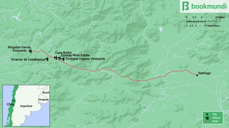 • Il est toujours possible de conduire soi-même et de faire une excursion d’une journée à partir de Santiago. Une fois sorti de Santiago, le trajet de 70 km jusqu’à la destination se fait presque entièrement sur la route 68. Cependant, n’oubliez pas qu’avec cette option, vous devez boire de manière responsable.