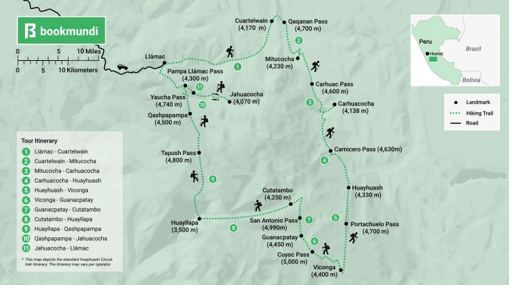 Il existe de nombreuses façons de parcourir le circuit du Huayhuash et la plupart des itinéraires prévoient au moins deux jours d’acclimatation avant le début du trek. La durée du trekking peut varier en fonction du nombre de jours de repos pris en compte, de l’itinéraire emprunté et de l’ajout éventuel de jours supplémentaires pour l’ascension d’un ou de plusieurs pics en cours de route. La plupart des versions du trekking commencent et se terminent à Llámac. Un itinéraire classique pourrait être le suivant,