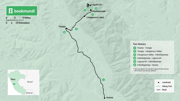 L’itinéraire de randonnée standard de la Laguna 69 démarre tôt à Huaraz. De là, les randonneurs sont conduits à Yungay, où certains circuits s’arrêtent pour le petit-déjeuner. Après Yungay, la route mène à la vallée de Llanganuco, d’où il est possible d’apercevoir les magnifiques lacs de Llanganuco, Chinancocha et Orconcocha, qui changent de couleur selon la période de l’année. Certains circuits s’arrêtent ici pour prendre des photos.