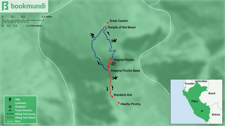 Le sentier commence au Warden’s Hut où vous devez présenter votre passeport et votre billet. Depuis le refuge, il faut marcher environ 15 minutes jusqu’à un endroit où le sentier se divise en deux. À cet endroit, vous devez suivre le panneau indiquant le sommet. Après 10 minutes supplémentaires, vous atteignez la base du Huayna Picchu, d’où une ascension raide d’environ 40 minutes vous mènera au sommet. Juste avant le sommet, vous devrez ramper dans une grotte étroite, après quoi vous atteindrez enfin le sommet et serez récompensé par des vues fabuleuses sur le Machu Picchu et les environs. Lorsque vous serez prêt à redescendre, un autre escalier raide vous conduira à un endroit où vous pourrez rejoindre le sentier d’origine jusqu’à la cabane du gardien.